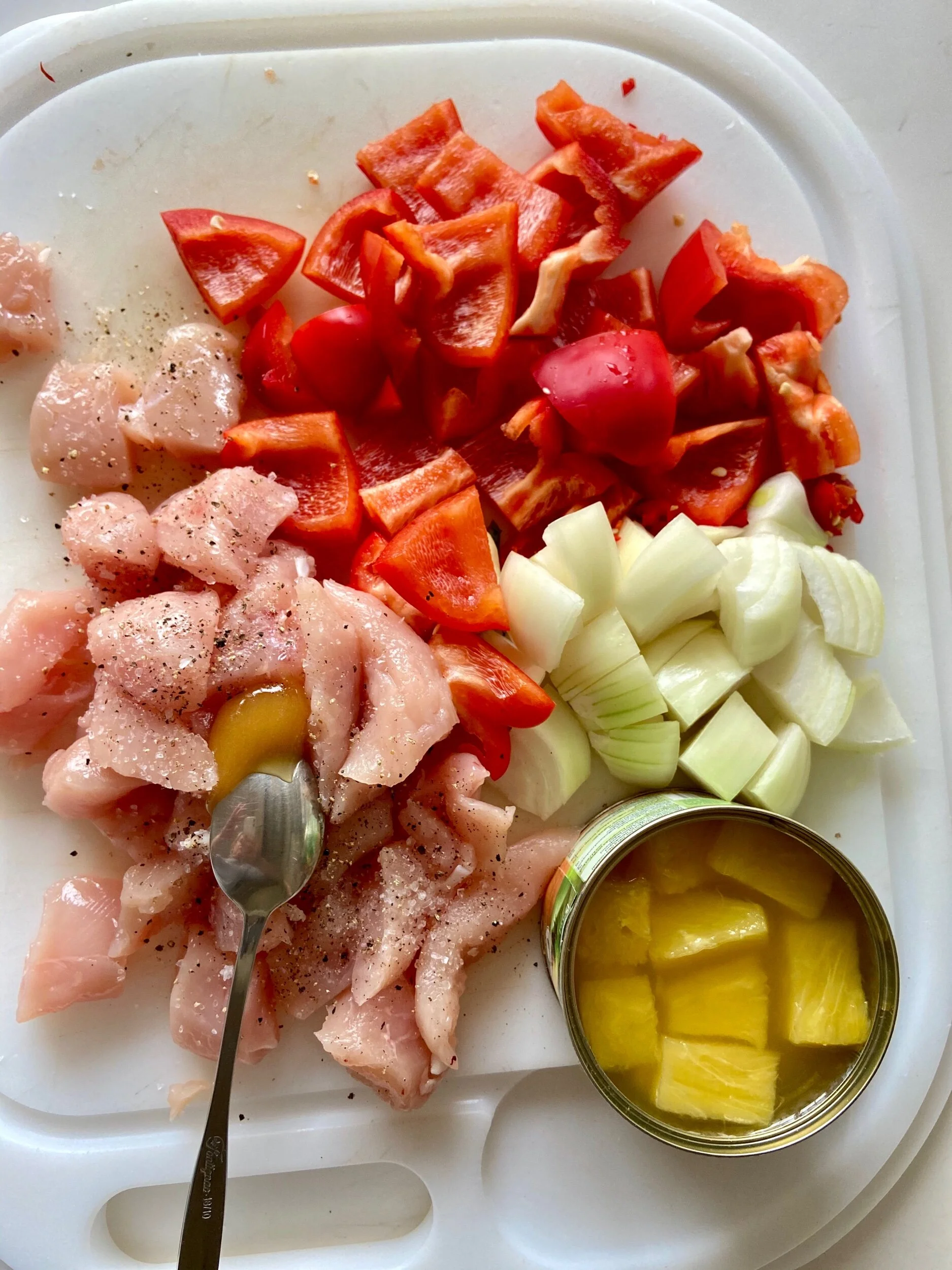 1. Vistas fileju sagriež 3-4 cm gabaliņos, papriku 2-3 cm kvadrātiņos, sīpolu nomizo, pārgriež uz pusēm un tad katru vēl 4 gabalos, ananāsu ripas 2-3 cm gabalos.