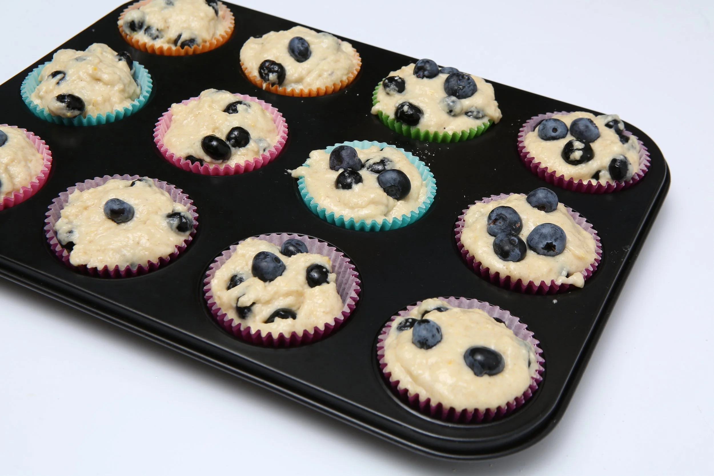 7. Mīklu pilda sagatavotajās formiņās, sadalot to vienmērīgi pa 12 trauciņiem. Pārber ar drumstalām un liek cepties cepeškrāsnī pa vidu aptuveni 22-25 minūtes. Līdzkamēr tie būs pacēlušies un nedaudz zeltaini brūni. Gatavību pārbauda ar kociņu. Ja izmanto saldētas ogas, varbūt jāpacep pāris minūtes ilgāk.